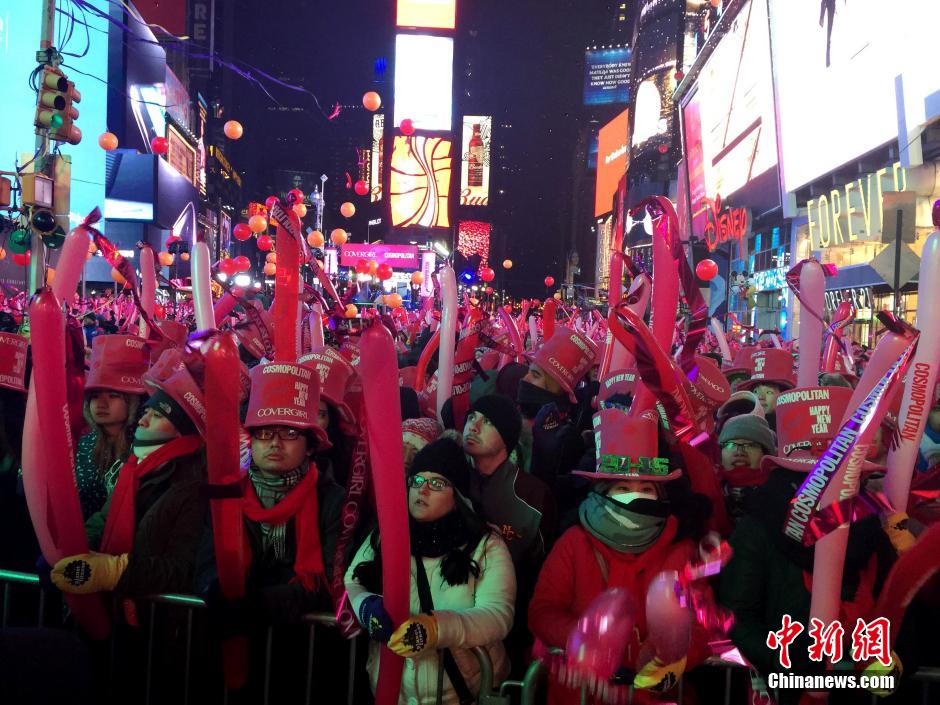 当地时间12月31日晚,上百万来自美国和世界各地的人们不畏寒冷汇聚在纽约时报广场,参加当晚狂欢庆典演出,迎接2015年的到来。人们在寒风中随着音乐载歌载舞,将纽约时报广场变成一片欢乐的海洋。中新社发 阮煜林 摄