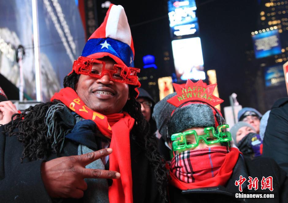 当地时间12月31日晚,上百万来自美国和世界各地的人们不畏寒冷汇聚在纽约时报广场,参加当晚狂欢庆典演出,迎接2015年的到来。中新社发 阮煜林 摄