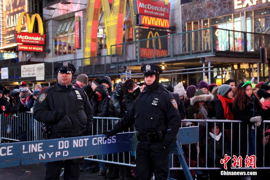 当地时间12月31日晚,上百万来自美国和世界各地的人们不畏寒冷汇聚在纽约时报广场,参加当晚狂欢庆典演出,迎接2015年的到来。当晚,纽约警方高度戒备。图为两位警察在路口执勤。中新社发 阮煜林 摄