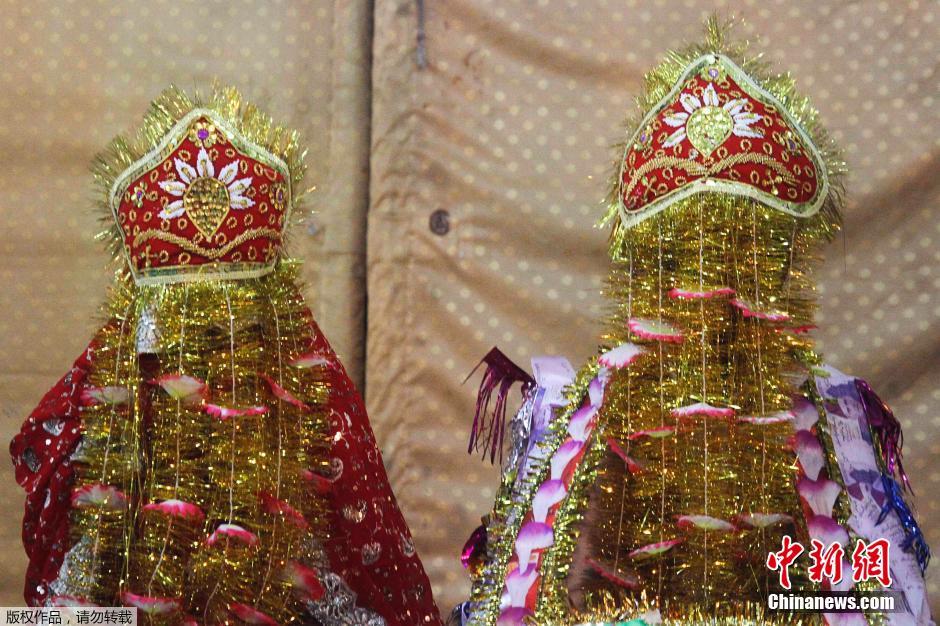 当地时间2015年1月2日,巴基斯坦卡拉奇,50对印度教新人身着传统服饰,举行集体婚礼。