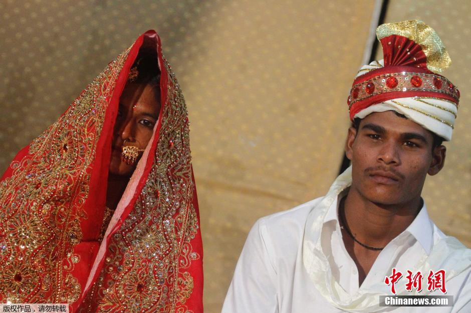 当地时间2015年1月2日,巴基斯坦卡拉奇,50对印度教新人身着传统服饰,举行集体婚礼。