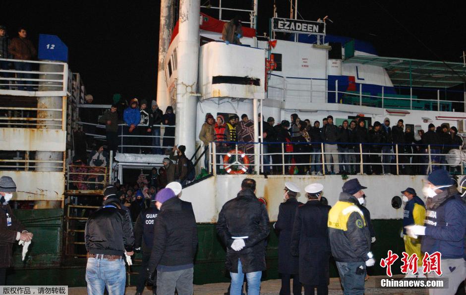 当地时间2015年1月2日,意大利科里利亚诺,意大利海警2日表示,一艘载有400多名非法移民的商船当日遭遗弃后已被海警方面成功援救。据报道,这艘船挂塞拉利昂国旗,燃料已耗光,被遗弃在距离意大利海岸大约40海里处。这是近几周来被遗弃在意大利附近海域的第三艘非法移民船。意方认为,遗弃船只已经成为非法移民偷渡者的新型犯罪手段,涉事船只往往是被专门买来用于运输非法移民的。
