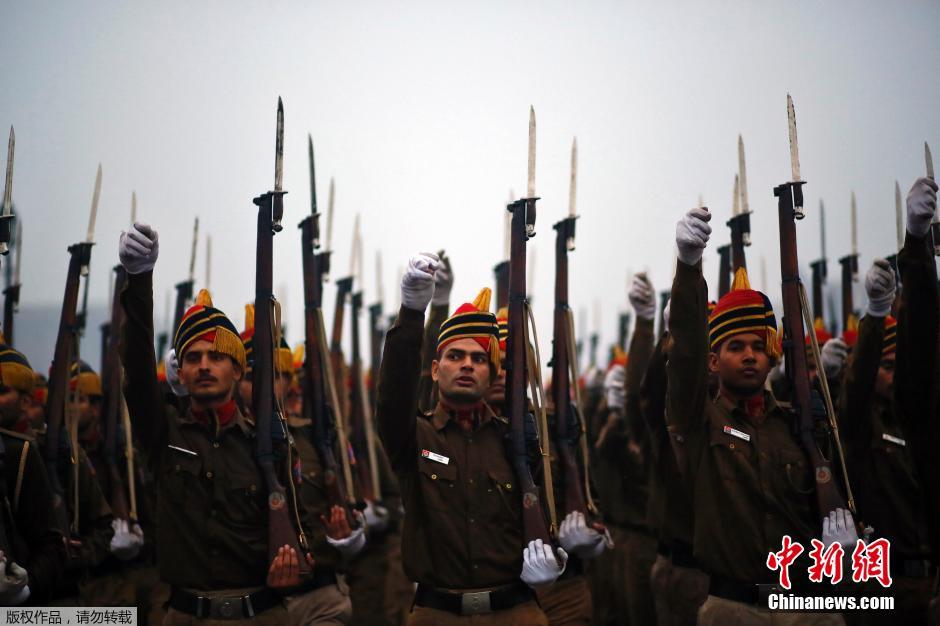 当地时间2015年1月2日,印度新德里,印度士兵在冬日中即将到来的共和国日阅兵式进行彩排。