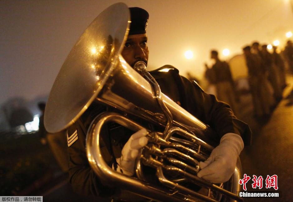 当地时间2015年1月2日,印度新德里,印度士兵在冬日中即将到来的共和国日阅兵式进行彩排。
