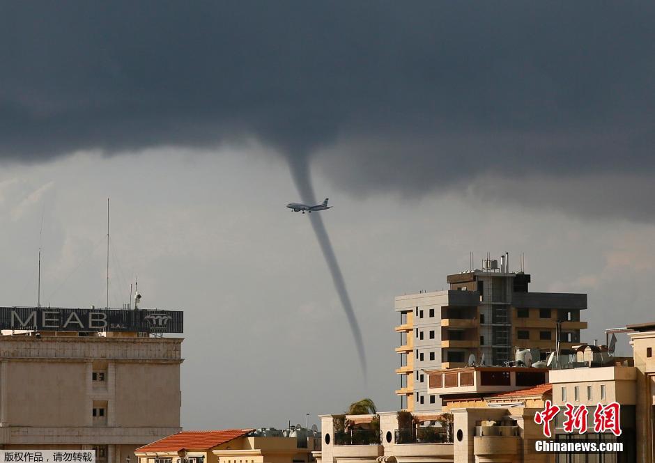 当地时间2015年1月1日,黎巴嫩贝鲁特,一架客机从地中海上的水龙卷前飞过。