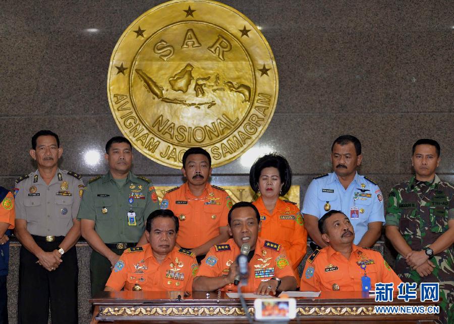 1月3日,印度尼西亚国家搜救中心负责人苏利斯提约(前中)在雅加达举行的新闻发布会上介绍失事客机残骸情况。苏利斯提约说,搜寻人员已在坠机海域发现亚航失事客机的四块巨大残骸,但尚未发现黑匣子。 新华社记者贺长山摄