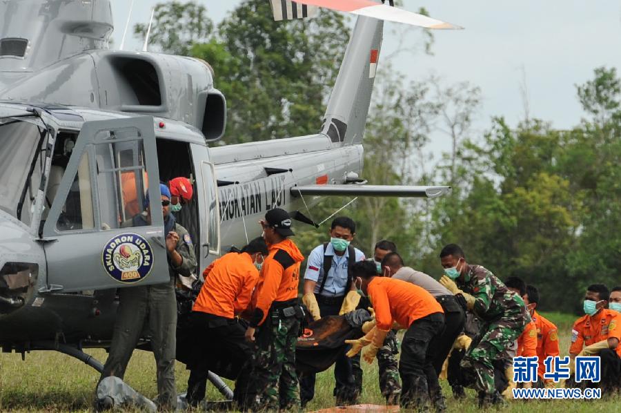 1月3日,在印度尼西亚庞卡兰布翁的伊斯坎德尔空军基地,救援人员将遇难者遗体搬下直升机。  新华社发(萨努里摄)