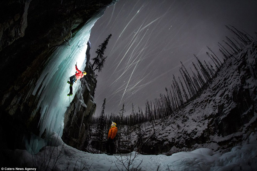在加拿大库特内国家公园,一名攀登者在努力向上攀爬,另一名同伴在下面用头灯为其照明。
