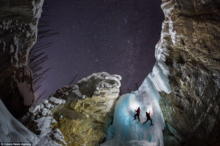 两名攀登者冒着零下30摄氏度的严寒,努力攀爬冰冻瀑布。