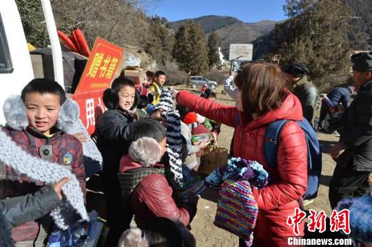 2015年元旦小长假,兰州城市学院志愿团队会同其他爱心企业为甘肃甘南州卓尼县的贫困藏族牧民送去了围巾、手套、护耳罩等物资。曹锋 摄