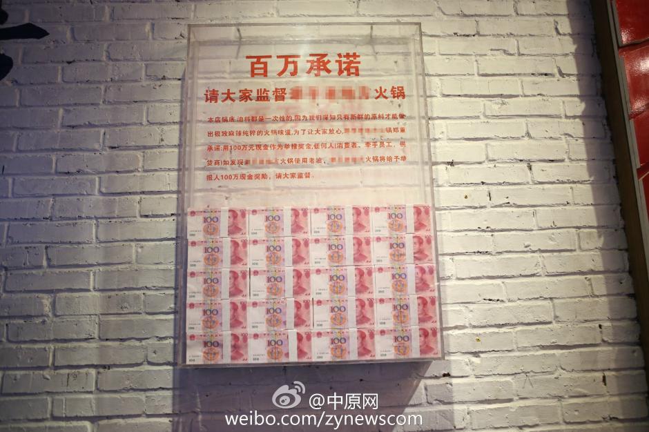 据中原网认证微博1月3日报道,网友爆料称,郑州一火锅店内墙上挂有一透明玻璃箱,内装大量现金!箱子上红色字体显示:“为让大家放心,xx火锅郑重承诺:用100万现金作为举报奖金,任何人如发现xx火锅店使用老油,xx火锅将给予举报人100万现金奖励。” 图片来源:中原网认证微博