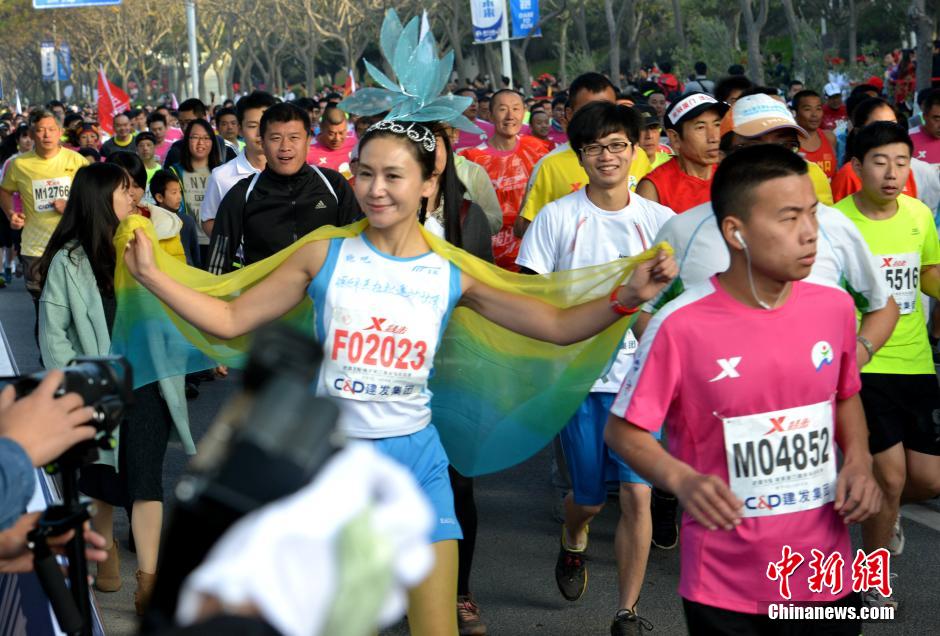 1月3日,赛道上许多参赛选手的个性装扮吸引了沿路许多观赛市民的眼球。当日,2015厦门国际马拉松赛在厦门鸣枪开赛,共有53个国家和地区的43064人报名参赛。中新社发 张斌 摄