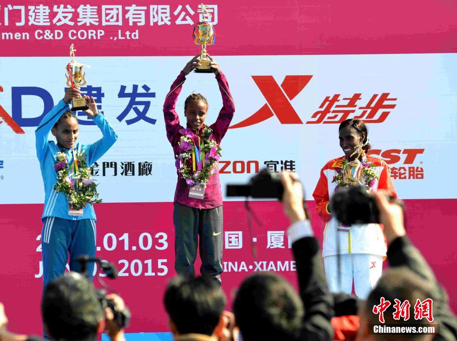 1月3日,埃塞俄比亚女选手玛瑙·迪巴巴跑出2小时19分52秒,以领先亚军8分钟的成绩,不但蝉联冠军,也将去年自己创下的厦马女子最好成绩,再提高2分钟之多。张斌 摄