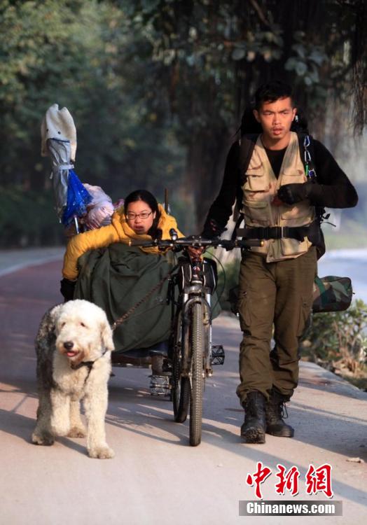01月03日,广西壮族自治区柳州市,柳州85后小伙丁一舟,为完成患病女友心愿,用一辆单车,一只工作犬,拉着女友的轮椅,1月3日从柳州出发开始爱心之旅。他们准备环游中国,在地图上“走”出一个心形路线。丁一舟女友患有遗传性小脑共济失调症,俗称企鹅病,无法正常走路,吃饭吞咽都很艰难。环游中国之旅困难重重,但两位年轻人表示成不成功不重要,重要的是追求梦想的过程,为了这次长途旅行,1日2日,两人已经在柳州市区“预热”徒步、露营两天。