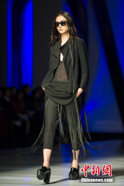 1月3日晚,香港设计师杨耀基携RIBYEUNG2015年最新设计的新品亮相中国—东盟国际时装周,黑超女模炫酷走秀展示其作品。图为模特走秀。 洪坚鹏 摄