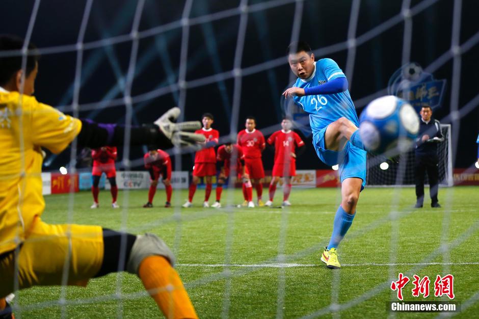 1月3日,“谁是球王”中国民间足球争霸赛华北大区决赛在山东淄博市展开争夺,山东新建路小学队、山东蓝色海洋队和山东黄海队从来自北京、天津、内蒙古和山东四省市的12支队伍中脱颖而出,分获华北大区娃娃组、青少年组和社会组“球王”。“谁是球王”中国足球民间争霸赛由中央电视台、国家体育总局、教育部等部门联合主办,活动旨在为普通百姓搭建一个全民健身、大众参与的圆梦平台。比赛分为娃娃组、青少年组和社会组三个级别,按照海选赛、大区赛、总决赛三个阶段进行。图为山东黄海队(蓝)在比赛中。 中新社发 富田 摄