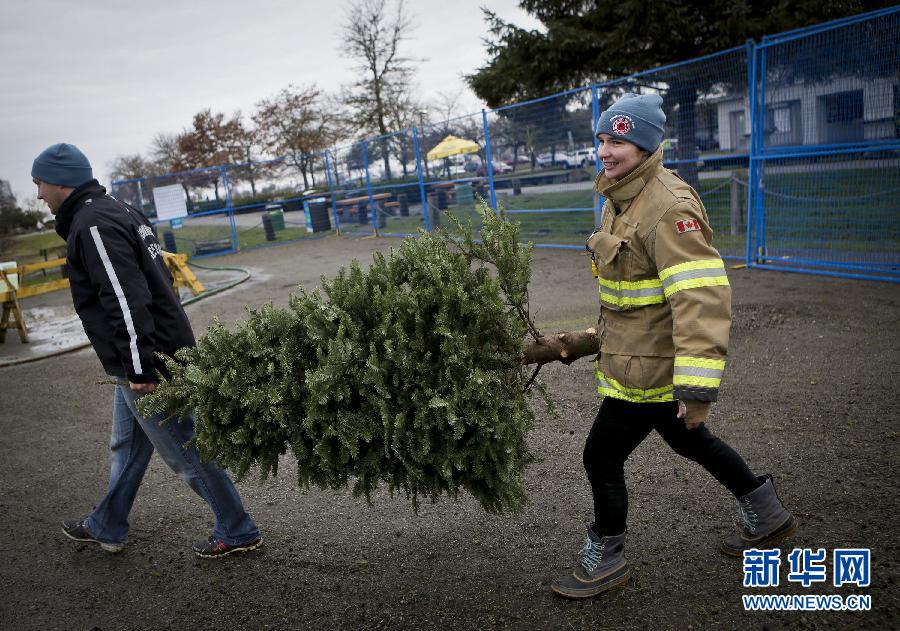 1月3日, 在加拿大里士满,消防员们协助居民回收圣诞树。当日是里市满市消防员举办的第33届圣诞树回收慈善活动,80名消防员利用休息时间帮助当地居民清理圣诞树。他们把收集的近3千棵圣诞树压碎后,变成可再利用的树渣和木屑。新华社发(梁森摄)