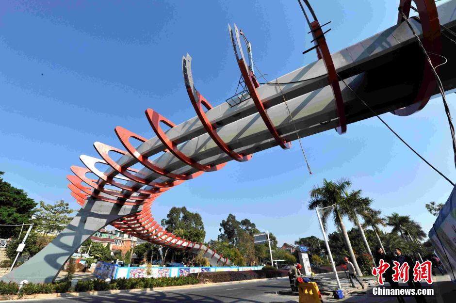 1月4日,被誉为“中国最文艺渔村”的厦门曾厝垵路口,一座名为“渔桥”造型别具一格的人行天桥即将完工。据了解,和城市中其它天桥相比显的十分与众不同,在设计阶段,该天桥就充分结合了当地文化特色。其主梁采用异型钢结构,其外形像是鱼骨,又像是传统渔船的结构,融合当地百年渔村历史,看上去“鱼”感十足。张斌 摄