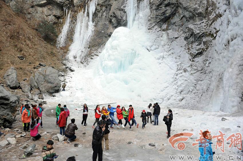 1月3日下午2时许,在户县涝峪黑山瀑布下,近百名游客在冰冻瀑布下争相拍照留念。这些游客大多来自西安、咸阳、铜川等地,多是“慕名而来”。“今年是第二次来,还带上了我媳妇。”咸阳的王先生说。