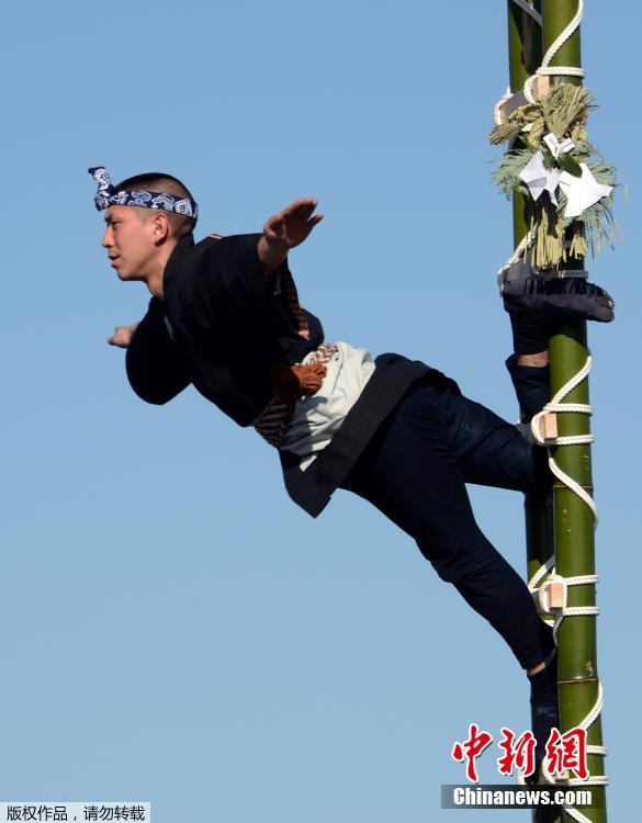 当地时间2015年1月4日,日本东京,日本消防员们在一家购物中心内攀竹梯玩杂耍,他们身着传统的消防员服饰,爬上高高的竹梯,做出各种高难度动作,与民众同庆新年。