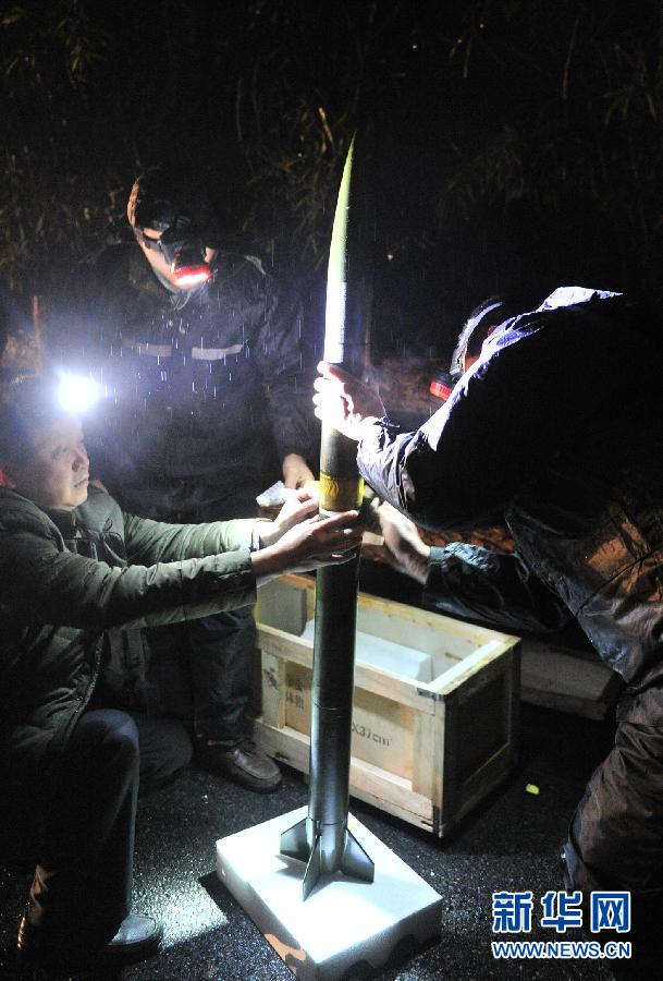 1月5日,南充市人工影响天气办公室工作人员打磨火箭点火触点。 1月3日开始,四川南充城区达到重度污染。5日凌晨,气象部门监测到南充市将有一次弱降水过程,南充市人工影响天气办公室工作人员出动移动车载火箭车,进行人工增雨,为天空洗尘。新华社发(成潮生 摄)