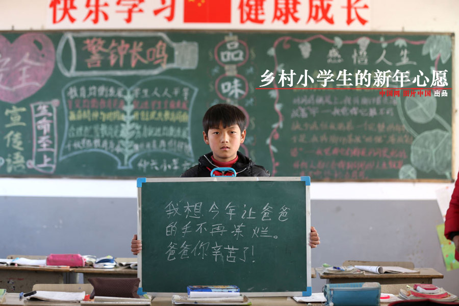 2014年12月26日,安徽省蚌埠市,固镇县仲兴乡仲兴小学六(2)班21名乡村小学生在2015年新年来临前,拿起小黑板写下自己的新年心愿。希望乡村街道更干净,空气更好,农村家庭能用上自来水以及务工在外的爸爸妈妈能回家陪自己吃顿团圆饭成焦点。孩子们的心愿很简单,也很朴实,简单的一句话,却包含纯真的心愿和祝福。在对自己家庭印象的描述中,对于父母的理解和感恩让人感动。