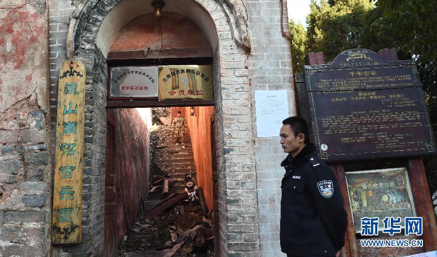 1月4日,一名警察在被大火烧毁的云南巍山古城拱辰楼前执勤。 1月3日凌晨,拥有600多年历史的云南巍山古城拱辰楼,在一场燃烧了2个小时的大火中成为废墟,仅剩几根焦黑的木梁和断壁残垣。 “新华视点”记者现场调查发现,这起火灾并没有以往古城火灾常见的消防水源不足、道路狭窄等问题。那么,究竟是什么导致了如此惨重的损失?新华社记者 蔺以光 摄