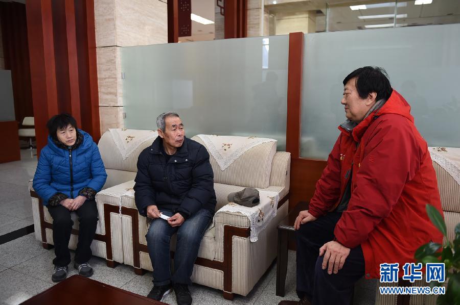 1月5日,新华社记者汤计(右)与蒙冤而死的呼格吉勒图父母李三仁、尚爱云在呼和浩特市中级人民法院休息室等待。当日上午,呼格吉勒图案嫌疑“真凶”赵志红在内蒙古自治区呼和浩特市中级人民法院第十法庭受审,法院公开审理检方指控的赵志红犯抢劫、盗窃罪部分。新华社记者邵琨摄