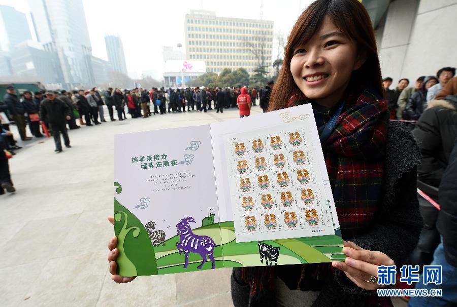 1月5日,一名工作人员在江苏南京鼓楼集邮专卖店门前展示《乙未年》特种邮票。当日,中国邮政发行《乙未年》特种邮票1套1枚,全套邮票面值为1.20元。该套邮票是中国邮政发行的第三轮生肖邮票的收官之作。《乙未年》邮票由吴冠英设计,以绵羊作为造型基础,羊角装饰有缠枝花草纹,羊身上为牡丹、莲花等花卉图案,并伴以祥云、水波纹,整个画面蕴含着吉祥、圆满和幸福绵长的寓意,寄托了对新的一年的美好祈盼。新华社记者孙参摄