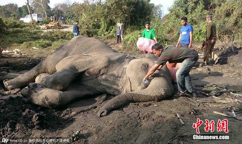 当地时间2015年1月4日,印度孟加拉邦,一只受伤的大象就地挂吊瓶接受救治。