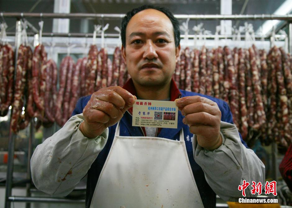 1月5日,在杭州闸弄口菜场内香肠老板于师傅向记者展示二维码名片。一边做香肠一边收钱既不方便也不卫生,于师傅的女儿便想到了时下流行的二维码支付。“我们毕竟现场加工的,纸钞细菌多,扫二维码让人家看起来也舒服!”记者了解到,于师傅的二维码支付摊位还颇受欢迎。今年元旦生意最好的一天,卖出3000斤的香肠。 中新社发 李晨韵 摄