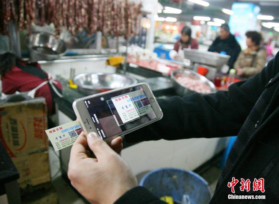 1月5日,在杭州闸弄口菜场内香肠老板于师傅向记者展示二维码名片。一边做香肠一边收钱既不方便也不卫生,于师傅的女儿便想到了时下流行的二维码支付。“我们毕竟现场加工的,纸钞细菌多,扫二维码让人家看起来也舒服!”记者了解到,于师傅的二维码支付摊位还颇受欢迎。今年元旦生意最好的一天,卖出3000斤的香肠。 中新社发 李晨韵 摄
