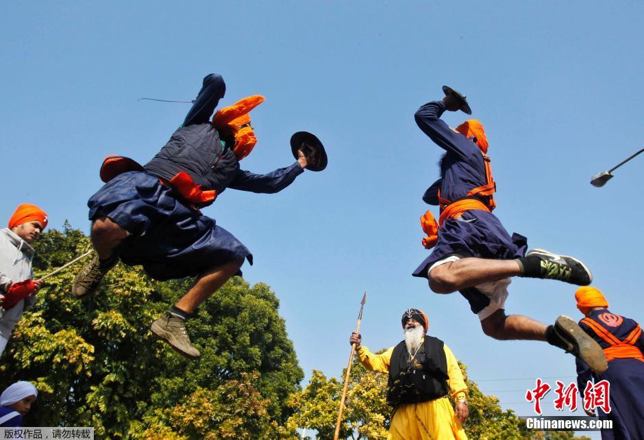 当地时间2015年1月5日,印度昌迪加尔,当地锡克教徒表演传统杂技,庆祝锡克教大师Gobind Singh诞辰。Gobind Singh是锡克教十大上师中的一位。现代的锡克教已成为一个国际性宗教,全世界的锡克教教徒约有二千万,大都居住在印度与巴基斯坦昔日的印北地区。