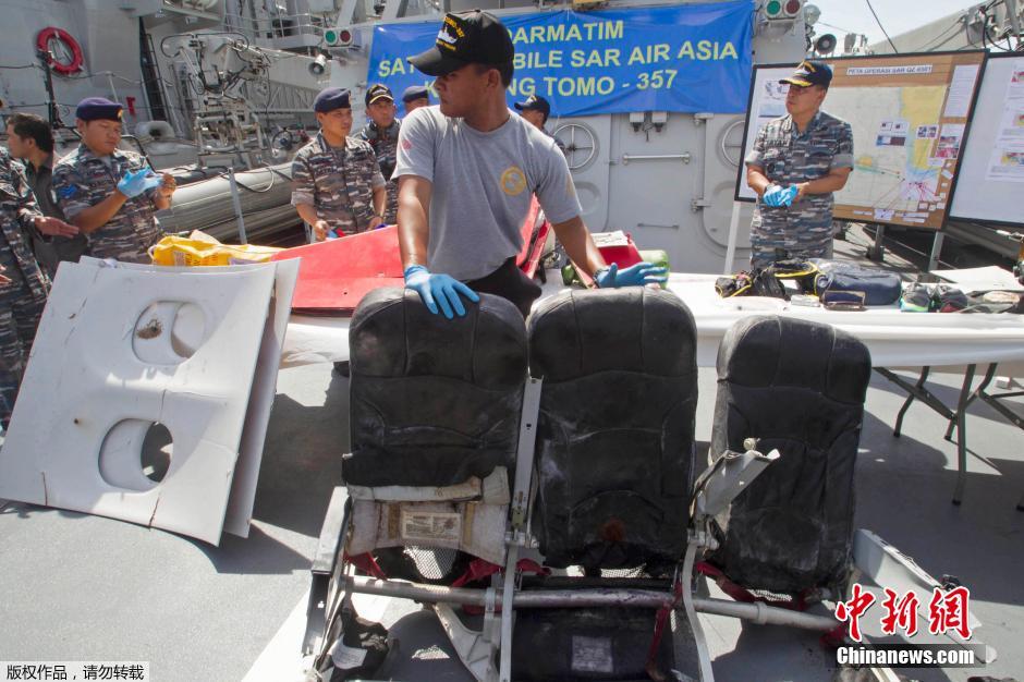 当地时间2015年1月6日,印尼庞卡兰布翁,参与亚航失事航班残骸搜寻的马来西亚皇家海军展示打捞上来的客机座椅残骸。