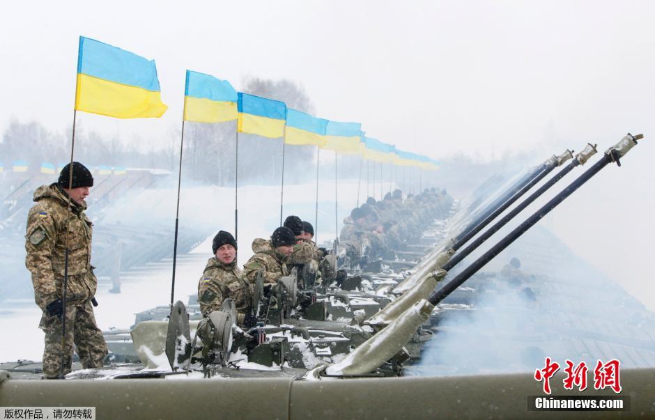 当地时间2015年1月5日,乌克兰日托米尔附近,乌克兰总统波罗申科冒雪在军事基地中慰问士兵,并出席向乌克兰军队移交超过一百台武器装备的仪式。