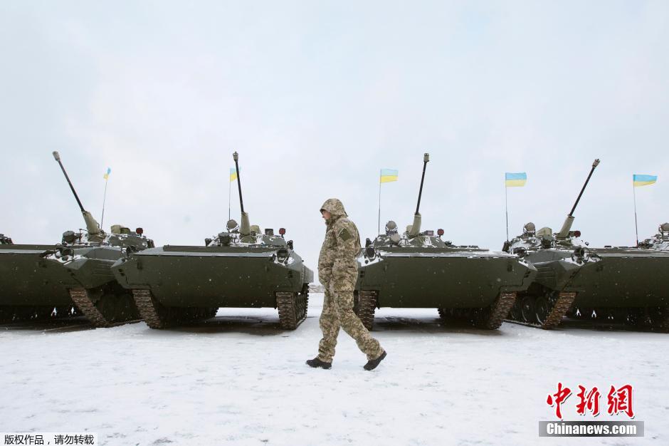 当地时间2015年1月5日,乌克兰日托米尔附近,乌克兰总统波罗申科冒雪在军事基地中慰问士兵,并出席向乌克兰军队移交超过一百台武器装备的仪式。