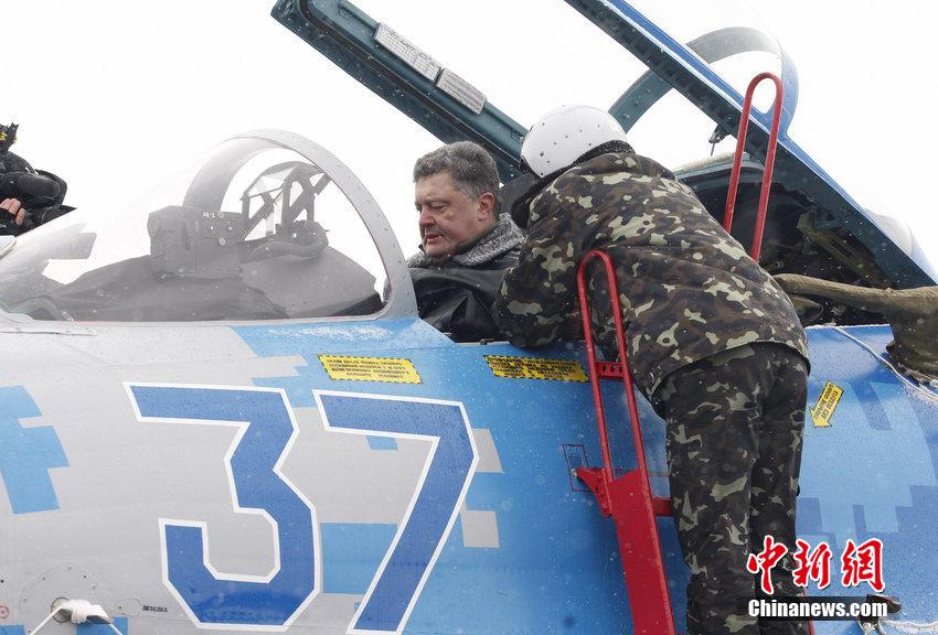 当地时间2015年1月5日,乌克兰日托米尔附近,乌克兰总统波罗申科冒雪在军事基地中慰问士兵,并出席向乌克兰军队移交超过一百台武器装备的仪式。乌克兰总统波罗申科亲自登上战机体验。