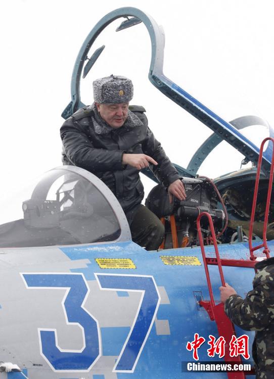 当地时间2015年1月5日,乌克兰日托米尔附近,乌克兰总统波罗申科冒雪在军事基地中慰问士兵,并出席向乌克兰军队移交超过一百台武器装备的仪式。乌克兰总统波罗申科亲自登上战机体验。