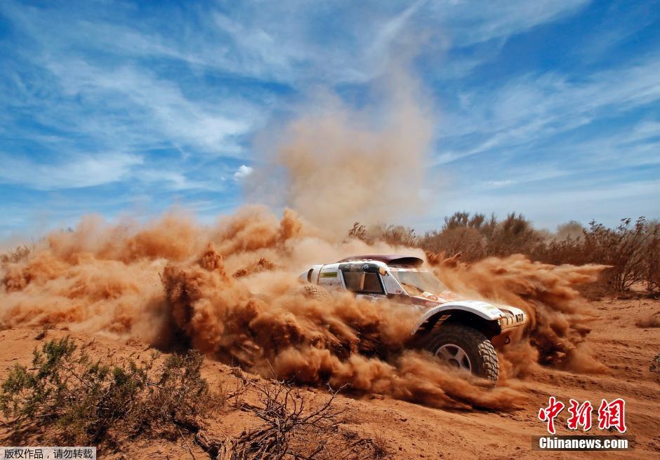 当地时间1月5日,2015达喀尔拉力赛第二日,卡洛斯帕兹-圣胡安赛段,各路竞速好手们都驾驶着自己的座驾在大漠里疾速狂奔,扬起一路黄沙。本次达喀尔拉力赛是此项赛事的第37届,有来自53个国家的665名选手征战,还包括11名女车手。赛程从1月5日起至1月17日结束,分汽车组、摩托车组、4轮摩托组和卡车组四个组别,参赛车辆将途径阿根廷、智利和玻利维亚三个国家。