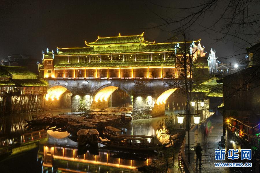 入夜,旅游胜地湖南湘西凤凰古城沱江沿岸灯火璀璨、霓虹闪烁,古城的夜景五彩斑斓,美不胜收(1月5日摄)。凤凰古城沱江风光带夜景亮化工程于2011年正式启用,总投资近1.6亿元。元旦过后,当地政府对亮化工程的LED灯进行维护,确保凤凰古城夜景灯光的正常使用,提升旅游形象。新华社记者 龙弘涛 摄
