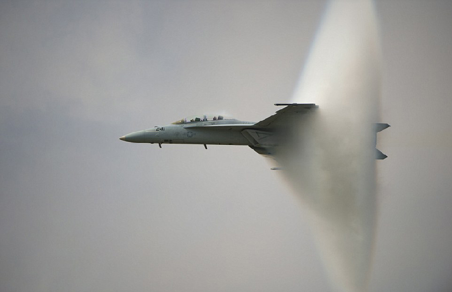 当超级大黄蜂战斗机的时速达到1225公里接近音障时,会创造出蒸汽锥。它与音爆不同,后者是当飞机突破音速时产生的声音。(网页截图)