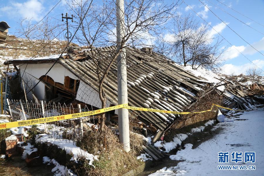 1月5日在波黑卡卡尼镇拍摄的山体滑坡损毁的房屋。当日,波黑首都萨拉热窝附近的卡卡尼镇遭遇山体滑坡,造成1死4伤,数所房屋被埋。 新华社发(哈里斯·梅米亚摄)