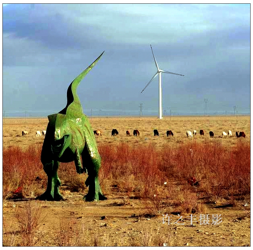 2014年12月30日,在内蒙古北部与蒙古国的扎门乌德隔界相望的茫茫的戈壁,草原的深处,侏罗纪时代的巨型恐龙雕塑与现代的大型风力发电车遥相呼应,已成为当地的一景。 工人日报-中工网记者许之丰摄影报道记录于内蒙古二连浩特
