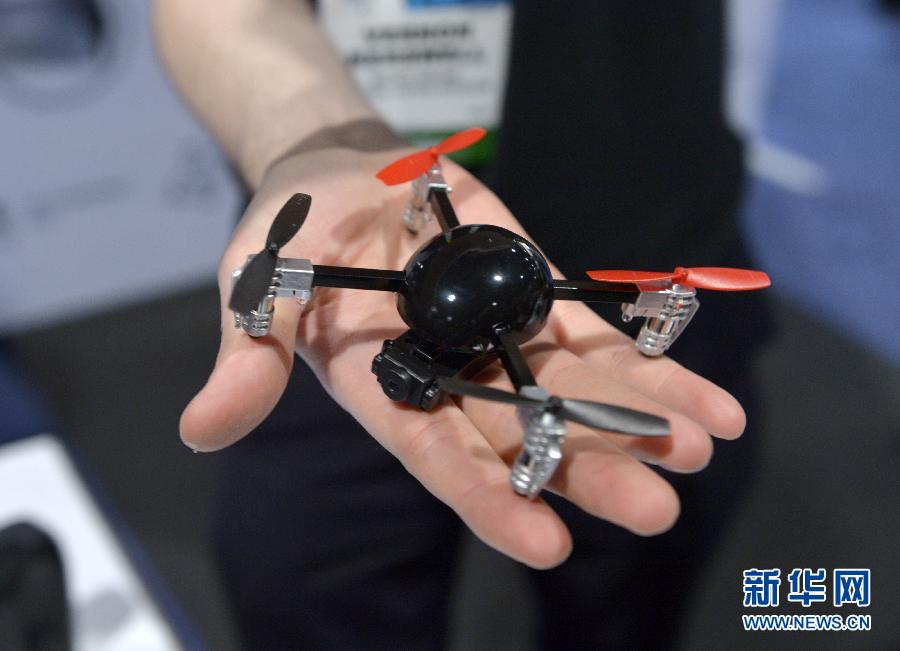 1月6日,在美国拉斯韦加斯举行的2015年国际消费电子展上,一名工作人员展示一款带摄像头的迷你民用无人机。 2015年拉斯韦加斯国际消费电子展首次开设民用无人机展区,成为本次展会的一大热点。据展会主办方美国消费电子协会预测,2015年全球民用无人机销量将达到40万架,销售额达到1.3亿美元,比去年增长55%。新华社记者 殷博古 摄
