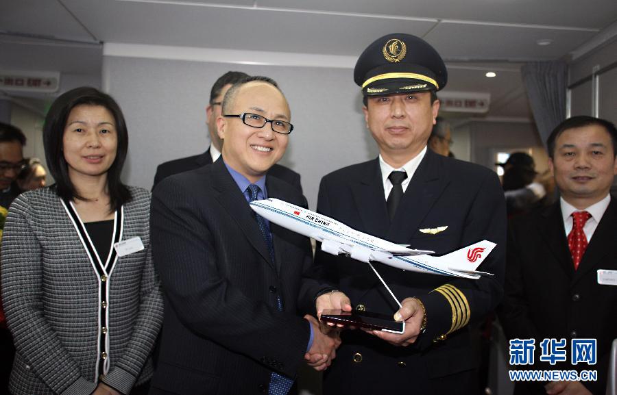 1月7日,在美国纽约肯尼迪机场举行的波音747-8洲际客机纽约至北京首飞仪式上,执飞机长张荣斌(前右)从美国波音公司航空市场营销服务区域总监刘江(前左)手中接过客机模型。