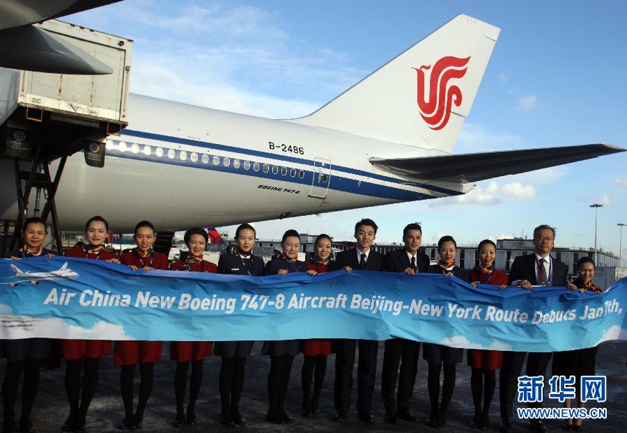 1月7日,在美国纽约肯尼迪机场举行的波音747-8洲际客机纽约至北京首飞仪式上,国航纽约营业部总经理周跃龙(右二)和机组空乘人员在客机前合影。新华社记者吴蓉摄