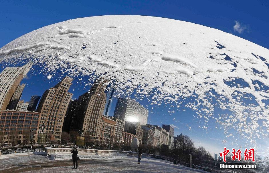 中新网1月8日电 据外媒报道,美国东部大部分地区日前遭寒流侵袭,各地普降大雪。当地时间6日,在美国伊利诺伊州芝加哥市,一座表面弧形的雕塑被大雪覆盖,行人的身影和芝加哥市的高楼大厦反射在雕塑的弧面上,整个场景看上去就像是一个装在玻璃球里的雪世界。