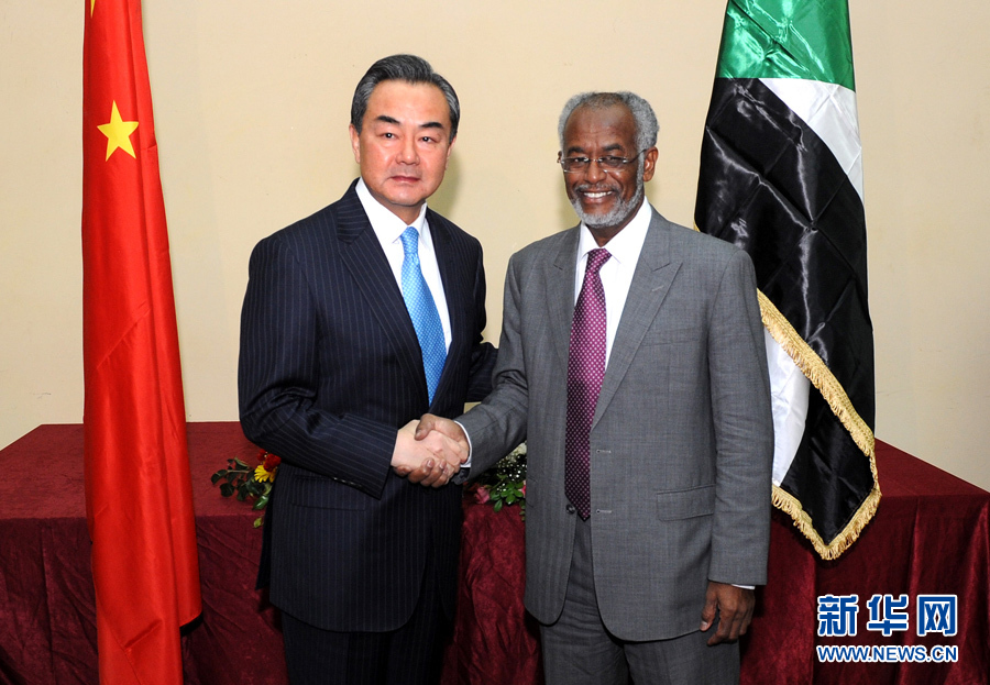 1月11日,在苏丹首都喀土穆,中国外交部长王毅(左)与苏丹外长卡尔提举行会谈。 新华社记者李紫恒摄