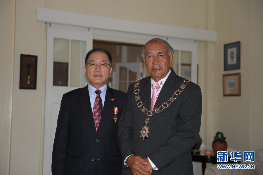 当日,斐济总统奈拉蒂考在总统府会见了即将任满回国的中国驻斐济大使黄勇,并向他授予一枚奖章,以表彰他为促进斐中关系发展所做的杰出贡献。新华社发(迈克摄)