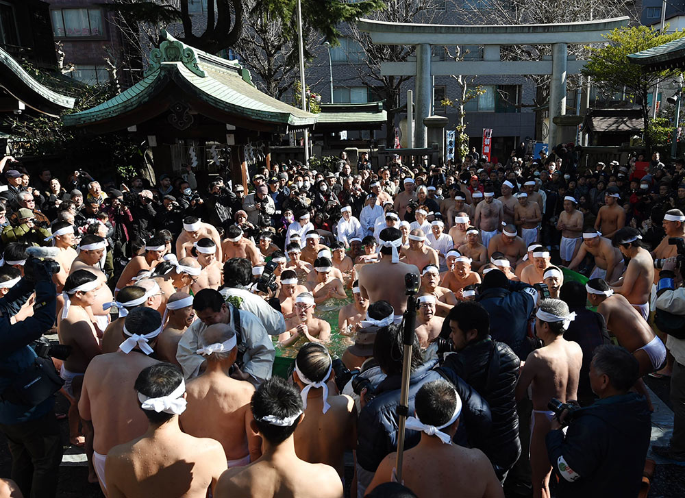 2015年1月11日,人们在日本东京的一座神社参加“冷水浴”活动。新华社/法新